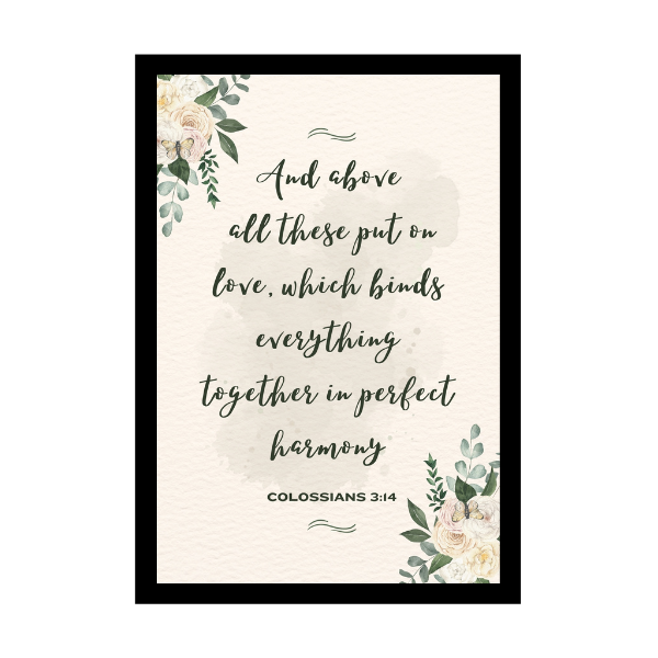 - An eye--catching home decor with an elegant solid wood frame will impress your guests and family deeply. The inspirational word “And above all these put on love, which binds everything together in perfect harmony”- colossians 3:14 in the Bible inspires you to face life positively and bless you.
