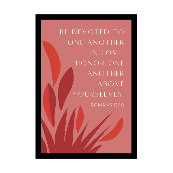 - An eye--catching home decor with an elegant solid wood frame will impress your guests and family deeply. The inspirational word “Be devoted to one another in love. Honor one another above yourselves.”- Romans 12:10 in the Bible inspires you to face life positively and bless you.