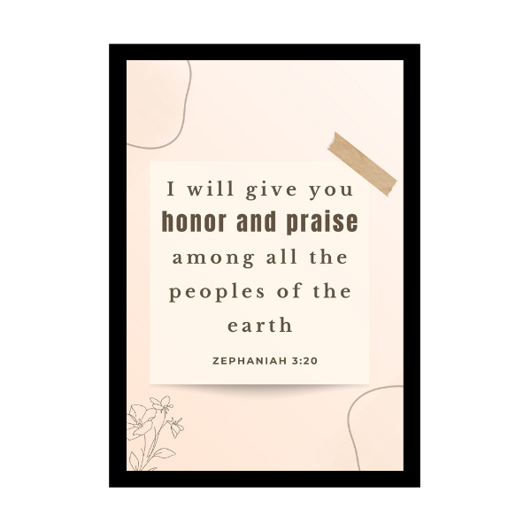 - An eye--catching home decor with an elegant solid wood frame will impress your guests and family deeply. The inspirational word “I will give you honor and praise among all the peoples of the earth”- Zephaniah 3:20 in the Bible inspires you to face life positively and bless you.