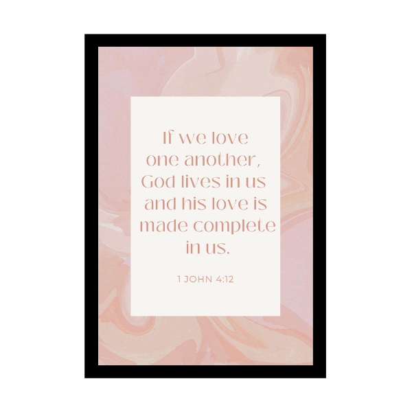 - An eye--catching home decor with an elegant solid wood frame will impress your guests and family deeply. The inspirational word “If we love one another, God lives in us and his love is made complete in us.”- 1 John 4:12 in the Bible inspires you to face life positively and bless you.