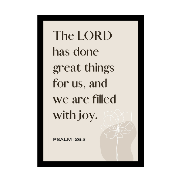 - An eye--catching home decor with an elegant solid wood frame will impress your guests and family deeply. The inspirational word “The LORD has done great things for us, and we are filled with joy.”- Psalm 126:3 in the Bible inspires you to face life positively and bless you.