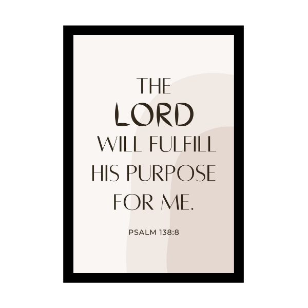- An eye--catching home decor with an elegant solid wood frame will impress your guests and family deeply. The inspirational word “The LORD will fulfill his purpose for me”. - Psalm 138:8 in the Bible inspires you to face life positively and bless you.