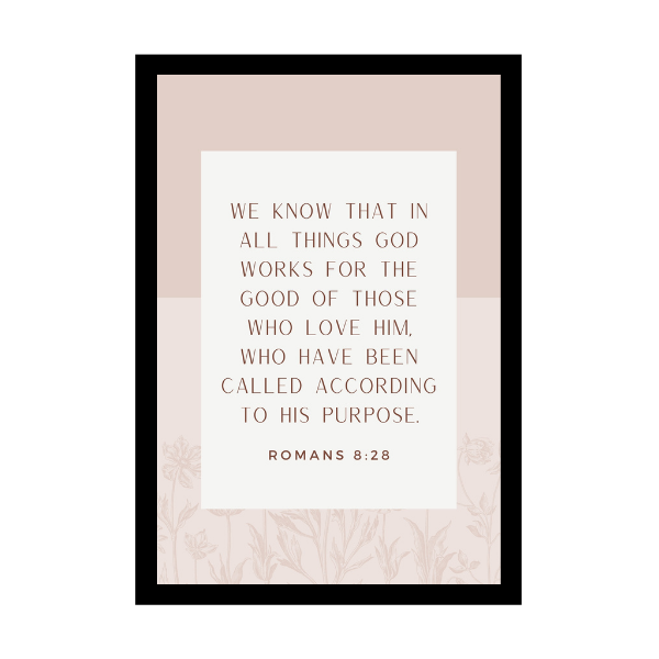 - An eye--catching home decor with an elegant solid wood frame will impress your guests and family deeply. The inspirational word “We know that in all things God works for the good of those who love him, who have been called according to his purpose.” -Romans 8:28 in the Bible inspires you to face life positively and bless you.